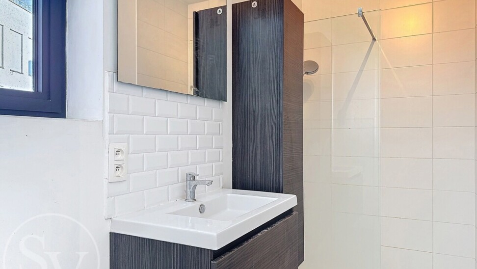De slaapkamer ligt rustig aan de achterzijde en heeft een eigen terras van 4 m². De badkamer beschikt over daglicht, een wastafel in meubel en een inloopdouche. Aansluitend is er een praktische bergruimte met individuele cv-ketel op aardgas en AEG-wasmachine. Een apart toilet maakt het geheel compleet.