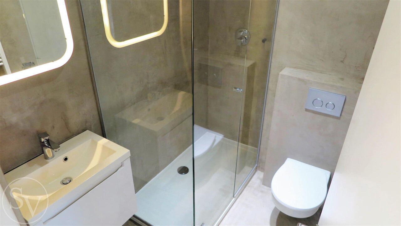 De moderne badkamer is compact maar praktisch ingericht en beschikt over een ruime douche, toilet en wastafel in meubel. Via de nachtgang bereikt u de twee slaapkamers, rustig gelegen aan de achterzijde van het gebouw en uitkijkend op het terras.