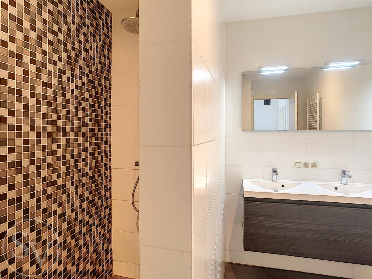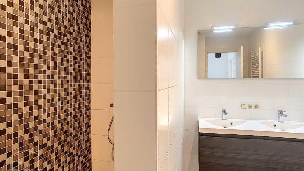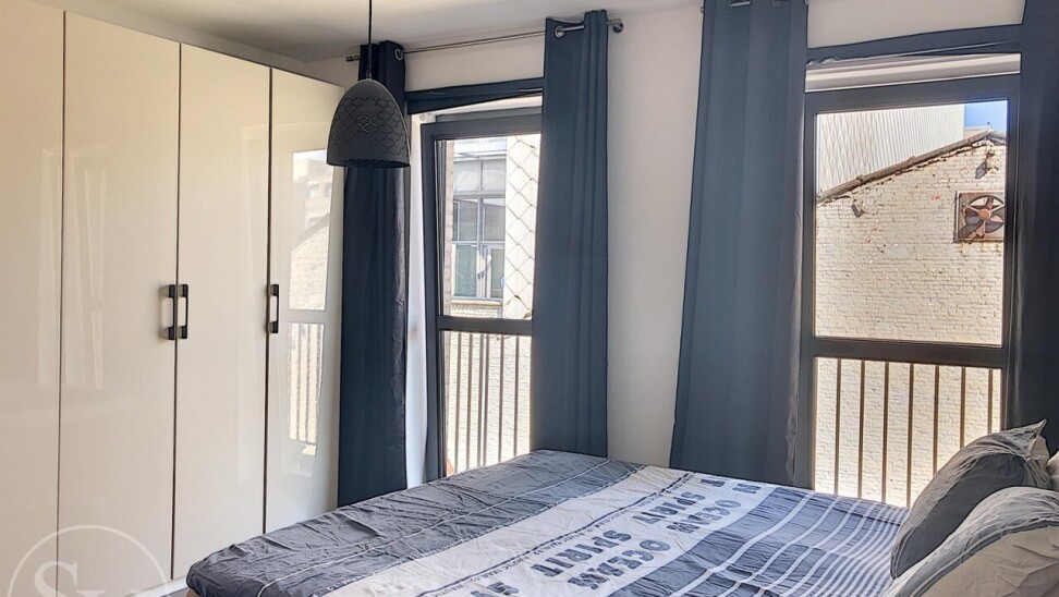 De twee slaapkamers liggen rustig aan de achterzijde van het gebouw en geven beide uit op een tweede, langgerekt terras (8 m²). De badkamer beschikt over een inloopdouche en een lavabo in meubel. Verder is er een veiligheidsdeur, een ondergrondse autostaanplaats (nr. 6) en een private kelderberging.