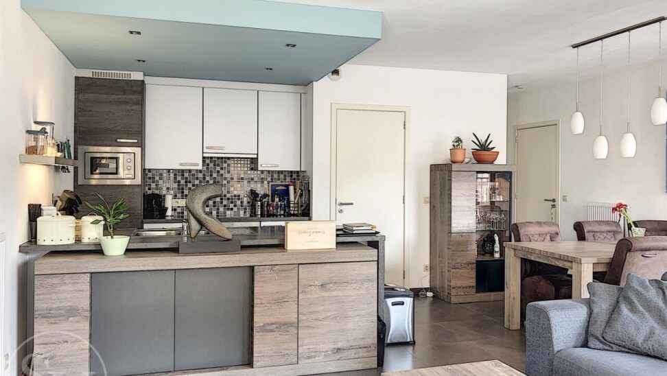 U komt binnen via de inkomhal met toilet. De ruime leefruimte baadt in het licht en sluit aan op een overdekt terras (8 m²), ideaal om te ontspannen. De volledig ingerichte open keuken is voorzien van alle hedendaags comfort. Aansluitend bevindt zich een praktische berging/wasplaats.