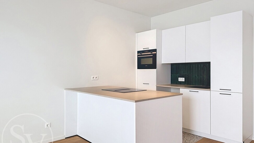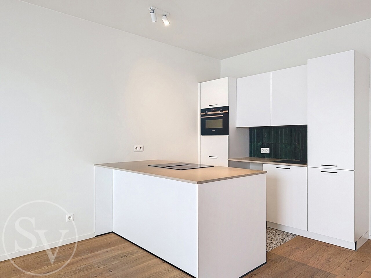 De open keuken is uitgerust met moderne toestellen en vormt een mooi geheel met de leefruimte.