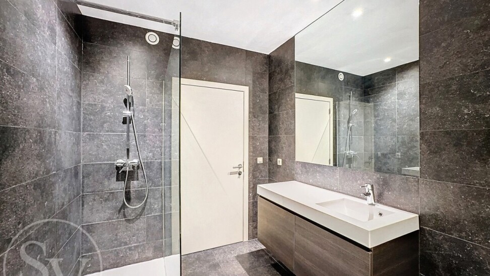 De nachthal leidt naar twee slaapkamers van respectievelijk 9,5m² en 14m², een afzonderlijk toilet en de badkamer met lavabo in meubel, ligbad en ruime inloopdouche. Er is tevens een grote berging met de CV-brander en aansluiting voor de wasmachine. De natuurstenen vloer die door het hele appartement loopt, maakt het geheel nog ruimer en oogt stijlvol.