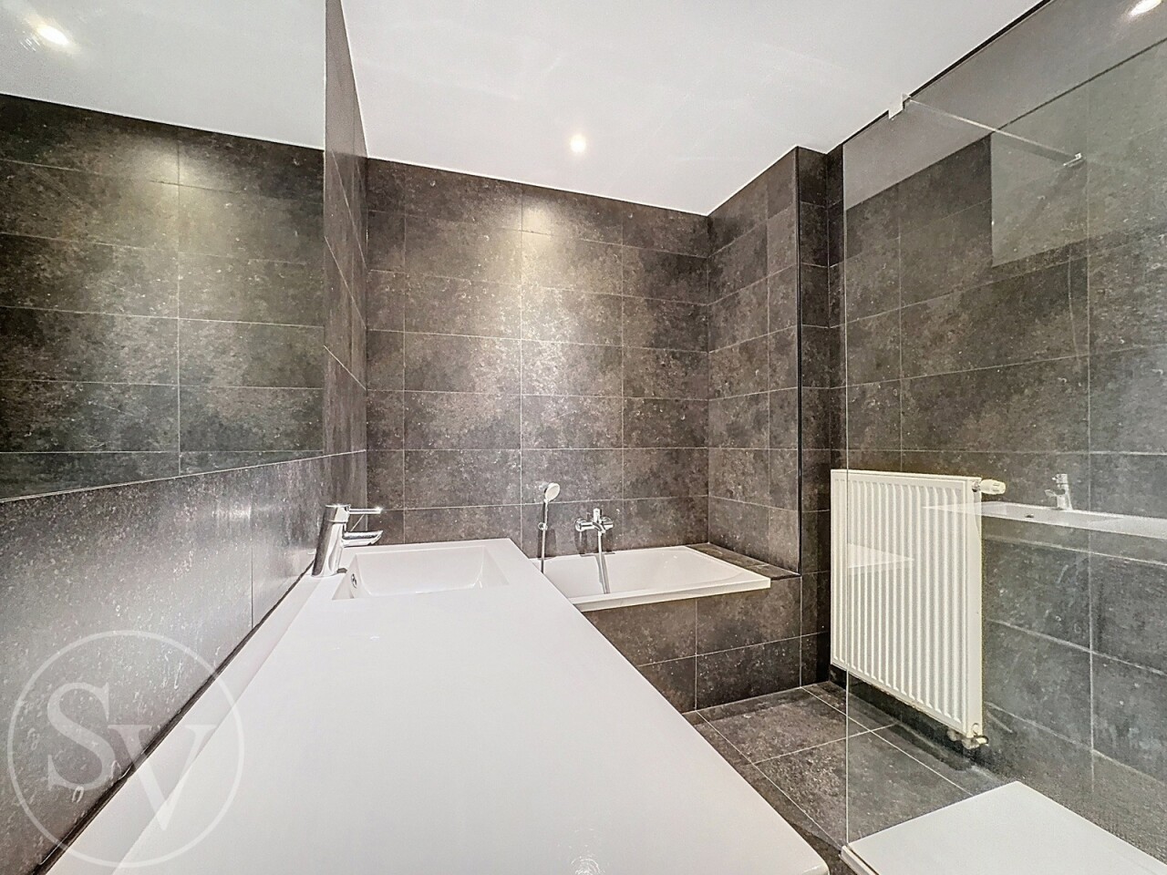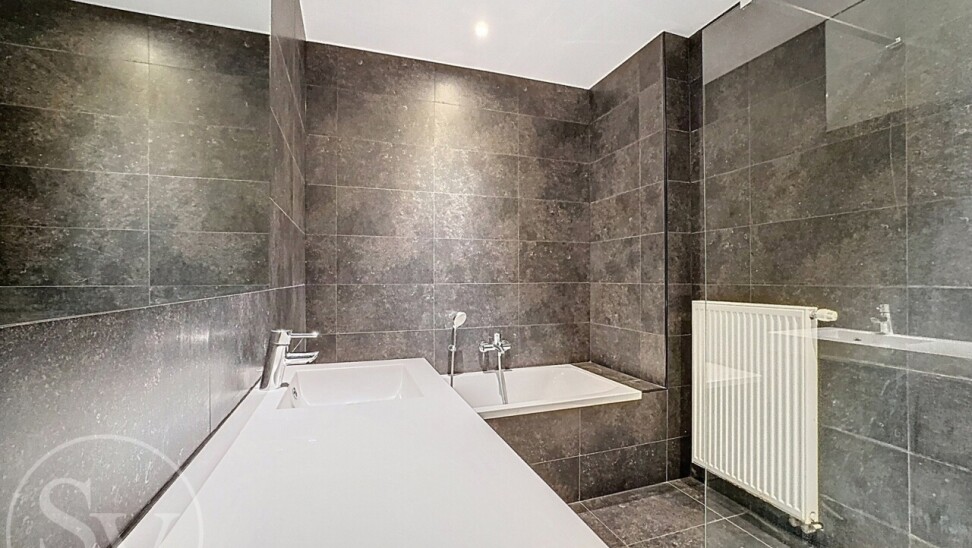 De nachthal leidt naar de twee slaapkamers (9,5 m² en 14 m²), een afzonderlijk toilet en de badkamer met lavabo in meubel, ligbad en ruime inloopdouche. Verder is er een grote berging met CV-ketel en aansluiting voor wasmachine. De doorlopende natuurstenen vloer maakt het geheel stijlvol en ruimtelijk.